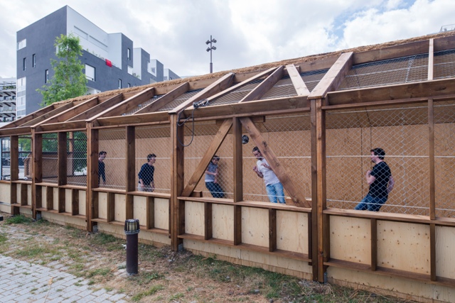 Il s’agit d’une longère classique recouverte de chaume et présentant une facette grillagée soutenue par des portiques en bois. La présence du chaume était une volonté de la part des architectes qui voient en elle un clin d’œil au paysage ligérien environnant, elle permet également de protéger les joueurs de la chaleur et du soleil. La façade perforée outre son rôle de ventilateur naturel, donne sur la promenade piétonne et l’ensemble constitue une belle opposition avec le béton et le métal des bâtiments environnants.