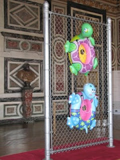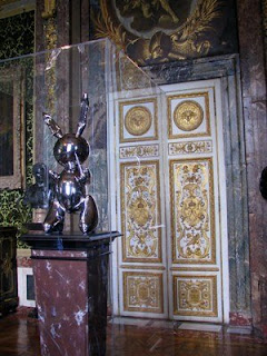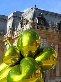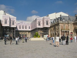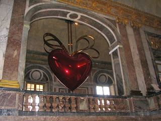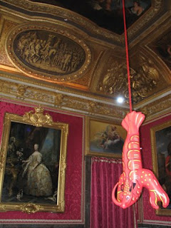 Le spectacle commence dès l’arrivée au château, dehors, dans la cour, une sculpture d’une couleur pas très ordinaire nous attend. On peut même s’amuser à trouver des images du château reflétées sur cette œuvre unique. Dans le château, en parcourant les pièces, on a la surprise de voir un chien de couleur magenta qui nous guette ou bien un énorme cœur rouge suspendu comme si on célébrait la Saint Valentin dans un décor de théâtre. Sans parler de la galerie des glaces reflétée dans une forme convexe qu’on a le plaisir de contempler. Et le homard suspendu dans l’une des salles ? Ainsi que ces tortues géantes, la panthère rose ou encore d’autres personnages qui plairaient tellement aux enfants de tous les âges. Ailleurs, dans une autre salle, quelques aspirateurs sous le regard bienveillant de Marie Antoinette attirent les touristes ébahis.