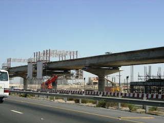 Dubaï a opté pour une ligne de métro aérienne qui va longer l’autoroute principale à 12 voies. Ayant peu de place la ligne doit se contorsionner parfois bizarrement pour éviter des piles de ponts et autres bretelles la faisant parfois ressembler à des montagnes russes. Cette ligne s’appelle la ligne rouge et va relier les différents quartiers de Dubaï entre son aéroport et Jebel- Ali le port commercial à 35 Km à l’ouest. Elle fera 52,1 Km et aura 17 stations.