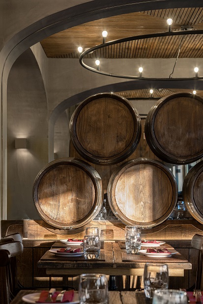 Afin de renforcer la sensation d’une cave, ces derniers ont opté pour l’utilisation de matériaux texturés et des couleurs sombres. « Ces caractéristiques permettent une plus grande expression spatiale, par le jeu expressif entre la lumière et l’ombre, mais aident surtout à résoudre l’un des plus problèmes les plus courants dans les restaurants prospères, le bruit excessif causé par le son de réverbération. » Ajoutent les architectes.