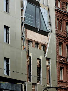 Elle est visible de loin, la façade enrobée d’un curieux revêtement. Jouxtant un immeuble en béton sobre et un autre en pierre de taille, le voilà, le nouvel emblème du « Printemps ». Une enveloppe qui telle une greffe s’accroche à l’existant et alterne le verre et le métal dans un mouvement lent pour nous projeter ensuite dans le monde de la haute-couture et du design. Alors que certains habitants y voient un arrière-goût des colombages très chers aux alsaciens, d’autres crient à la déforme d’un emblème et la fin d’une époque.