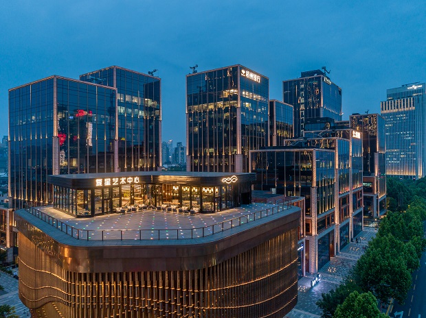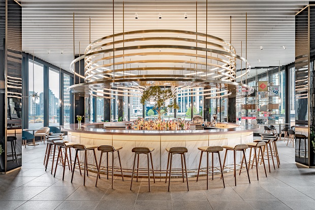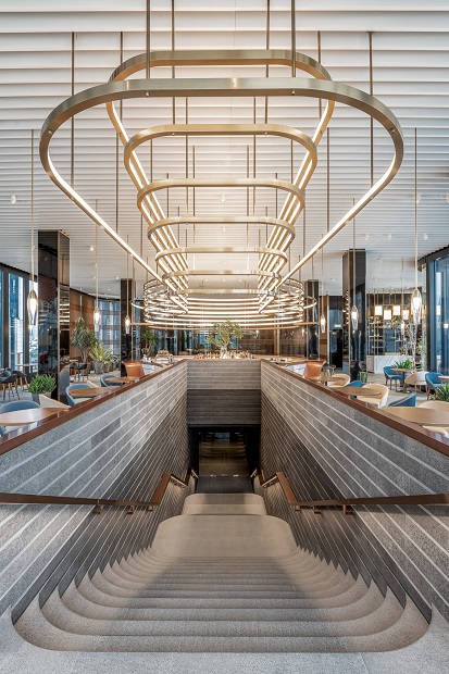 L’alliance de matériaux tels que le bronze, les textiles gris clair et le comptoir en marbre blanc reflète la fonctionnalité du Cloud Bistro, qui s’adapte à toutes les occasions, du jour à la nuit. Cette palette de couleurs confère à l’espace une flexibilité supplémentaire, en faisant un lieu polyvalent pour tous types d’événements, des brunchs du week-end aux thés de l’après-midi, en passant par les soirées et les cocktails. L’adaptabilité était également une priorité essentielle pour l’espace d’exposition d’art, situé à l’extrémité du bâtiment. Dans cette optique, les étagères sont modulables et une série de caissons lumineux peut être facilement personnalisée pour s’harmoniser avec l’identité visuelle des expositions. Avec Cloud Bistro, Kokaistudios a cherché à estomper les frontières entre extérieur et intérieur, architecture et rivière, espace artistique et restaurant, et à créer un prolongement naturel de la Fondation Fosun. Ce résultat a été obtenu en intégrant délibérément l’intérieur de Cloud Bistro au langage architectural existant du bâtiment. Par exemple, la courbe de son principal point d’accès, un escalier en pierre, se prolonge pour former des banquettes qui entourent un bar central. Au-dessus, une installation en cuivre et laiton, évoquant un nuage et incrustée de LED, rappelle la façade architecturale spectaculaire du bâtiment. Selon les architectes, l’un des principaux défis consistait à construire le lieu autour d’une œuvre d’art préexistante de l’artiste japonais Tatsuo Miyajima. Intitulée « Counter Sky Garden », cette œuvre est un compte à rebours numérique composé de quelque 300 LED installées sur ce qui était autrefois le toit du quatrième étage de l’immeuble. Désormais partiellement intégrée à l’espace du Cloud Bistro, l’installation de Kokaistudios a veillé à ce que ses chiffres clignotants restent largement visibles. Point focal saisissant du lieu, tant à l’intérieur que sur son agréable terrasse extérieure, cette œuvre lumineuse accompagne la transition du jour à la nuit dans le bistro, créant un lien entre le compte à rebours en constante alternance et le cours de la rivière en contrebas. Le Cloud Bistro s’appuie sur la vaste expérience internationale de Kokaistudios dans la création de restaurants et bars spectaculaires sur les toits. Parmi ses réalisations figurent le Bar Rouge de Shanghai, la boîte de nuit emblématique située au dernier étage du Bund 18, classé au patrimoine mondial de l’UNESCO, et pour le Four Seasons Kuwait, les restaurants jumeaux Sintoho et Dai Forni surplombant le golfe Persique. Pour la Fondation Fosun, les concepteurs ont mis à profit ce savoir-faire pour créer un restaurant attrayant qui constitue une destination à part entière. S’appuyant sur son emplacement et son prestige, le Cloud Bistro représente un prolongement réussi de l’un des plus récents emblèmes architecturaux de Shanghai.
