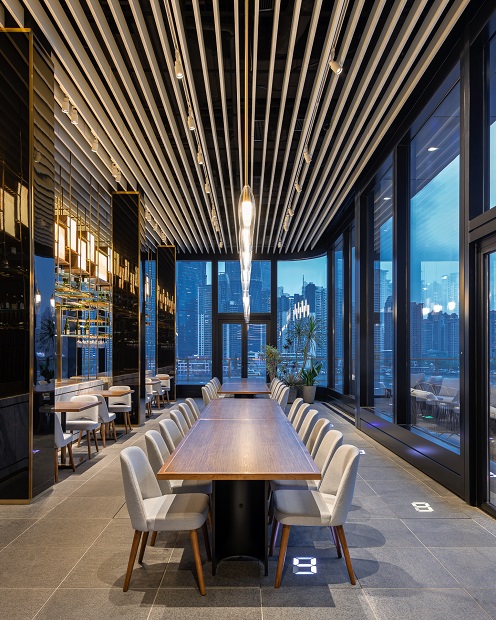 C’est une destination à part entière grâce à ses vues imprenables sur la ville, le Cloud Bistro s’intègre également à la programmation du centre, notamment pour l’organisation de conférences et de soirées de gala. Respectueux du langage architectural du bâtiment existant, conçu par Thomas Heatherwick, le lieu est un prolongement naturel de ce qui est rapidement devenu une icône shanghaienne, et a été pensé pour offrir transparence et flexibilité. Ce projet, au sein du Bund Finance Center, l’un des complexes immobiliers emblématiques de Shanghai, a mis au défi Kokaistudios de concevoir et d’installer un bistro-bar-boutique d’art modulable au sommet du bâtiment phare de Thomas Heatherwick. Le Cloud Bistro tire pleinement parti de son emplacement prestigieux sur la rive ouest du fleuve Huangpu. L’ensemble installé dans un pavillon de verre, offre une vue panoramique spectaculaire sur la ville. Respectueux de l’esthétique architecturale existante, le lieu s’intègre harmonieusement au nouvel emblème de Shanghai, offrant de multiples possibilités de personnalisation et d’organisation d’événements. Conscients de ces facteurs, Kokaistudios a conçu un espace d’une grande légèreté, où transparence, ouverture et adaptabilité sont les maîtres mots de chaque élément du projet. Prenant place au sein d’une structure de verre située sur le toit du quatrième étage du bâtiment existant, l’espace est doté de fenêtres pliantes permettant une adaptation à la température et aux circonstances. Tirant pleinement parti de l’atout majeur du lieu, une vue panoramique sur le vieux et le nouveau Shanghai, un agencement flexible de sièges hauts et bas garantit à chaque convive une vue imprenable, tandis qu’une longue table commune modulable attire le regard vers le panorama fluvial.