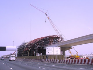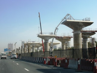 Dubaï a opté pour une ligne de métro aérienne qui va longer l’autoroute principale à 12 voies. Ayant peu de place la ligne doit se contorsionner parfois bizarrement pour éviter des piles de ponts et autres bretelles la faisant parfois ressembler à des montagnes russes. Cette ligne s’appelle la ligne rouge et va relier les différents quartiers de Dubaï entre son aéroport et Jebel- Ali le port commercial à 35 Km à l’ouest. Elle fera 52,1 Km et aura 17 stations.