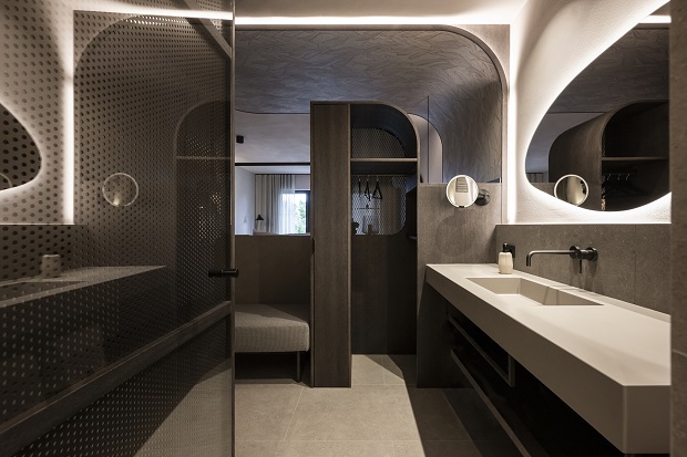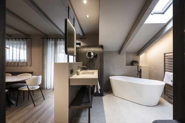 La maison d’hôtes se compose de trois bâtiments : la maison principale, une dépendance avec des appartements et un espace bien-être. Le projet s’est concentré sur la rénovation des 13 appartements de la dépendance, avec pour objectif non seulement de moderniser les intérieurs, mais aussi de repenser radicalement leur agencement : ouvrir l’espace central à la lumière naturelle et abolir la séparation traditionnelle entre salle de bain, chambre et salon. « Nous n’avons pas abordé le projet sous l’angle d’un agencement de mobilier standard, mais avec l’idée que chaque chambre devait devenir un espace bien-être privé pour les hôtes », explique Christian Rottensteiner, associé chez NOA et architecte principal du projet. « En partant du point de vue des hôtes, nous avons conçu les intérieurs pour repenser la division traditionnelle des pièces : le mobilier se déploie dans un continuum fluide, estompant les frontières entre salle de bain et espace nuit. » Comme dans de nombreux projets de NOA, la salle de bain bénéficie ici d’une attention particulière : c’est un espace ouvert sans limites marquées, conçu pour maintenir une forte connexion visuelle avec l’extérieur. Des surfaces généreuses et un souci du détail méticuleux en font un lieu de bien-être pour le corps et les sens.