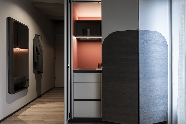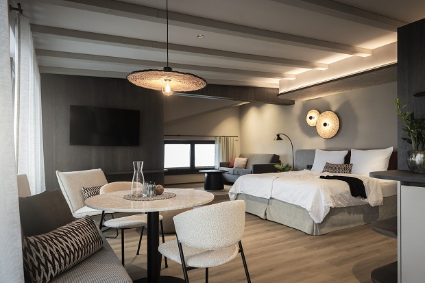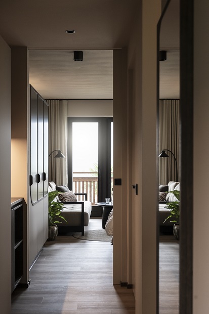 Le concept traditionnel de la pièce a été repensé : un module cuisine entièrement équipé est intégré à un meuble dédié, qui peut être ouvert ou fermé selon les besoins. Tout en conservant les ouvertures existantes, les nouveaux agencements garantissent une lumière naturelle homogène et un confort optimal. Les treize unités, réparties sur quatre étages, ont une superficie allant de 35 à 65 m². L’un des principaux défis a consisté à achever la construction dans un délai très court tout en mettant en œuvre avec succès le concept architectural, sans modifier les éléments porteurs, et en modernisant simultanément tous les systèmes techniques. « Le jardin de l’hôtel a servi de point de départ au concept de décoration intérieure : un jardin méditerranéen au cœur des Alpes. Notre idée était de traduire ces influences naturelles dans les matériaux et les couleurs – des tons chauds et terreux, des surfaces tactiles et un enduit à la texture brute », explique Christian Rottensteiner. « La riche variété de plantes témoigne de ce qui peut prospérer dans le Tyrol du Sud, et l’emplacement, surplombant le bassin de Merano, fait du Nutzhof une authentique retraite méditerranéenne. » Ainsi se tisse un dialogue subtil entre le nord et le sud, entre le calme alpin et la légèreté méditerranéenne, offrant aux hôtes une expérience régionale et sensorielle. « La beauté du projet se révèle dans les détails : un fauteuil en bouclé invitant à la lecture, un paravent en métal perforé préservant l’intimité sans cloisonner l’espace, et un éclairage doux accompagnant les premières lueurs du jour. Chaque recoin offre un moment d’intimité et de bien-être », explique Mara Jungmann, architecte d’intérieur.