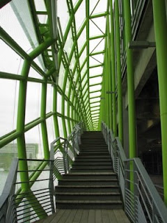 Un air de Beaubourg, oui et non, ici, une même couleur, très condensée sur la passerelle, alors que l’ancien immeuble est resté tel qu’il est. Les deux époques cohabitent.