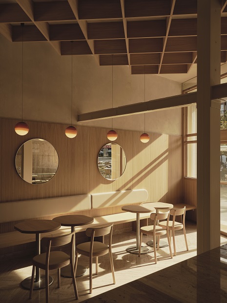 Pour donner vie à cette vision, les architectes ont conçu l’intérieur autour d’un élément géométrique clé : le carré pivoté ou le losange. Ce motif est appliqué de manière uniforme sur les plafonds, les sols et la façade, créant une identité visuelle unique à travers l’espace. La palette des matériaux s’inspire des couleurs et des textures des parfums de glaces les plus emblématiques de Regma, réinterprétés à travers des matériaux nobles et naturels tels que le marbre travertin, le bois de chêne et la peinture à base d’argile. À ce trio, il a été ajouté l’acier inoxydable, matériau essentiel en chambre froide, préservant ainsi un lien direct avec l’artisanat traditionnel de la glace. Le résultat est un espace qui plonge le client dans l’univers de Regma de manière abstraite et subliminale. Grâce aux couleurs, aux textures ainsi qu’aux géométries inspirées du produit et de l’héritage de la marque, les architectes ont doté l’ensemble d’une expérience sensorielle qui renforce l’identité de Regma et son évolution constante.